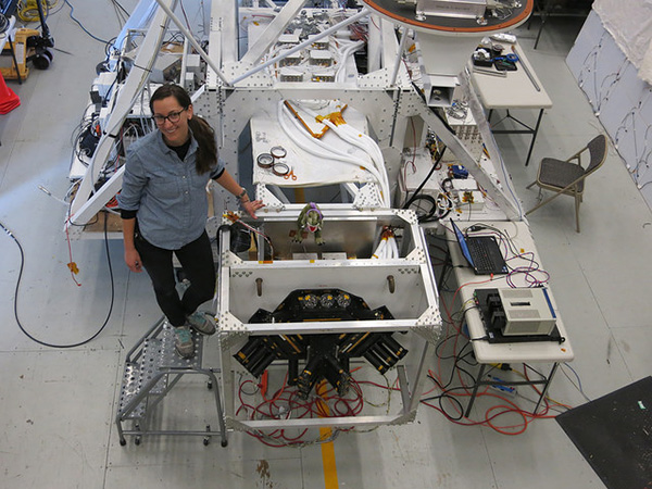 Nicole Duncan, a graduate student studying space physics at the University of California, Berkeley, stands next to the GRIPS payload. Credit: NASA, University of California, Berkeley-Hazel Bain