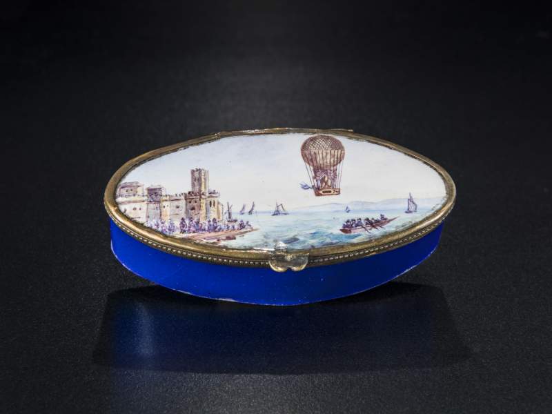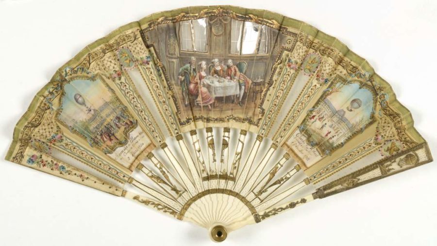 The exhibit begins with 35 objects made in the 18th and 19th centuries— decorative fans, china, snuff boxes, patch boxes, dance card cases, and so forth, featuring fascinating miniature scenes of ballooning flights, launches, and shows. Down the long gallery wall, 51 prints and 18th century hand-colored paintings trace the notions of flying, the invention of the balloon in 1783, in Annonay, France, and the subsequent “balloonamania” that swept cities in Europe, pulling in throngs of crowds to balloon launches. “Before the French revolution, fashion and balloons pervaded the French society. You could put a balloon picture on anything and it would sell,” said Dr. Crouch, also an award-winning aeronautical historian. “In the early 20th century, after World War I, the airplane was a big deal, and so people who were involved in aviation and interested in history began to collect this 18th century material. It was produced in abundance and available in antique shops,” he added.