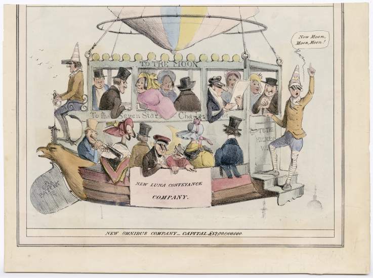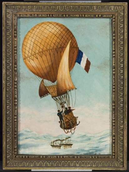 The exhibition is arranged in four sections. The “Four Fantastic Aeronauts” feature the Italian Vincenzo Lunardi, Englishmen James Sadler and Charles Green, and the American Thaddeus S. C. Lowe. As to how he settled on these four aeronauts, Dr. Crouch explained: “I decided to stick to the Kendall collection, and we decided not to use any portraits but only balloons. I was going to include Sophie Blanchard but there were not enough images of her in the Kendall collection.” The paintings capture their spectacular ascents, long-distance journeys, and aerial showmanship, as well as the idiosyncrasies, and comic and tragic situations.