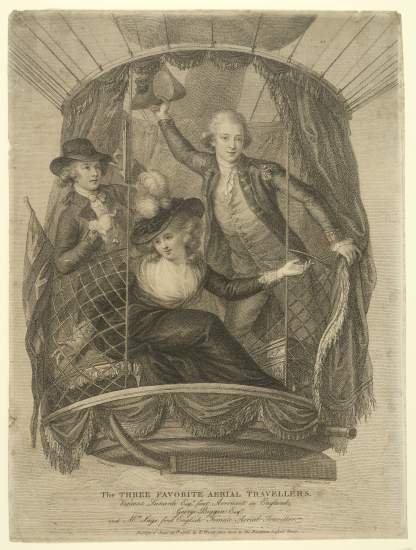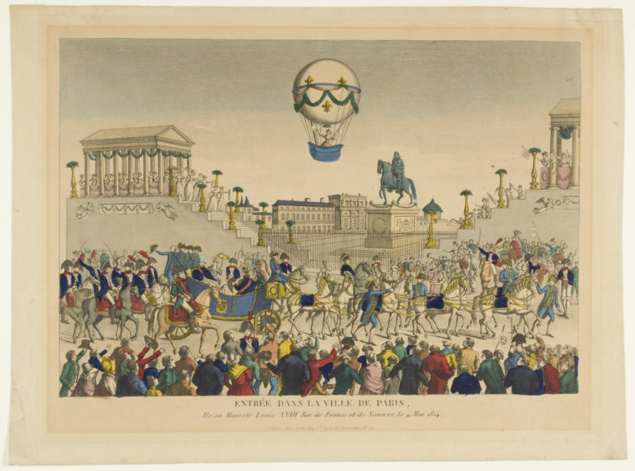 The petite and “bird-like” Madame Blanchard was also the official aeronaut to Emperor Napoleon and flew a balloon in honor of the coronation of Louis XVIII in 1814. A hand-colored engraving depicting the latter event is part of a recently opened exhibition titled “Clouds in a Bag: The Evelyn Way Kendall Ballooning and Early Aviation Collection.”