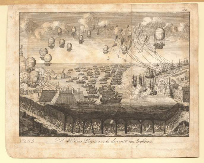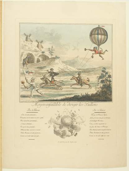 Another fanciful print suggests the aerial invasion of Britain, which may be reflecting a military issue of the time that troubled many French people—the fortress of Gibraltar, strongly defended by the British, could not be accessed by land or sea. A story goes that, one night in the year 1777, before he invented the hot air balloon in 1783, Joseph Montgolfier was sitting by the fire at his home. A great dreamer, Joseph imagined whether French troops could be lifted and floated by air above the heads of the English, by the same force that was lifting the sparks from the fire. He knew he had an experiment on hand when he also noticed the chemise (or skirt?) that was hanging to dry billow upward from the smoke. “Even before the first balloon flight in Annonay, Joseph had written to his brother in 1782 that flying a balloon would be like putting a cloud in a paper bag,” said Dr. Crouch.