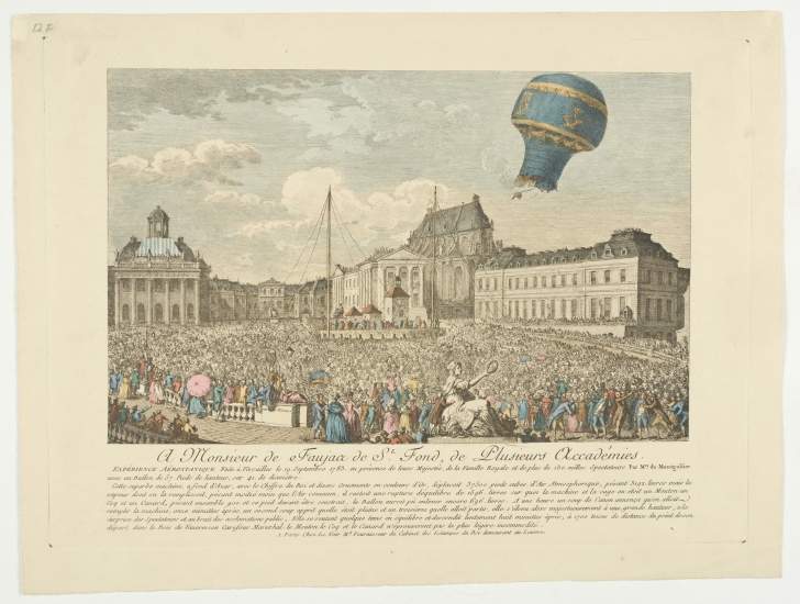 The first aviators, a sheep, a duck, and a rooster take off in a balloon in front of the Palace of Versailles. Etching, French 1783. National Air and Space Museum, Smithsonian Institution